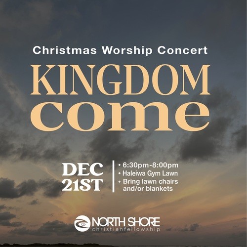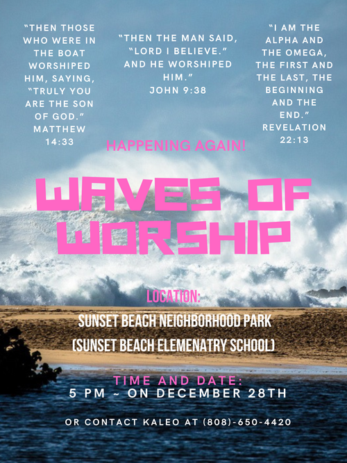 Young Adults and Teens - join Kaleo and Kamalei Taylor for a night of Worship and fellowship on Sunday, December 28th at 5pm. Meet at the neighborhood park next to Sunset Beach Elementary School. For more information, contact Kaleo at 808-650-4420.