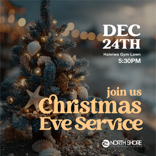 Join us on the gym lawn for our Christmas Eve Service on Wednesday, December 24th at 5:30pm. We'll sing Chirstmas carols, enjoy a skit performed by our keiki and hear a Christmas message from Pastor Danny! There will also be cocoa and cookies available.